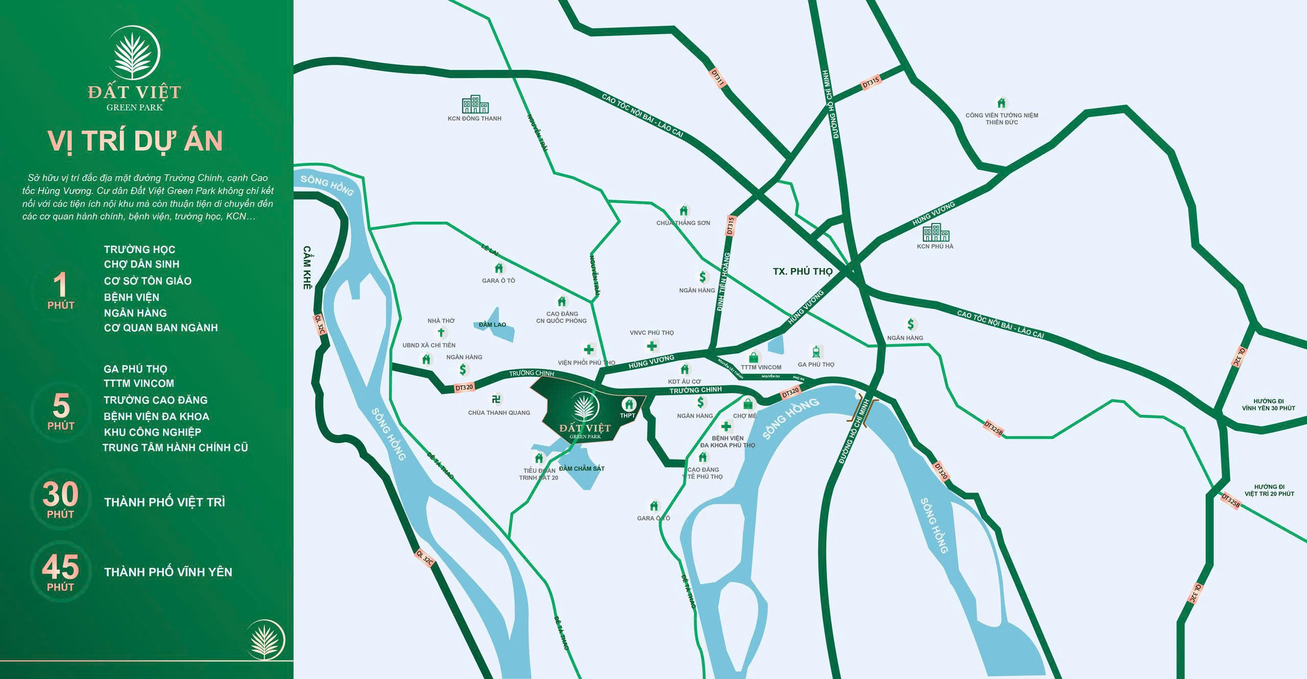 Tọa lạc tại vị trí vàng kết nối trực tiếp các trục giao thông huyết mạch, tâm điểm quy hoạch mở rộng hạ tầng vùng tại Thị xã Phú Thọ. Từ Đất Việt Green Park, cư dân chỉ mất vài phút để kết nối tới hàng loạt địa điểm trọng yếu và tiện ích sôi động của thành phố:
