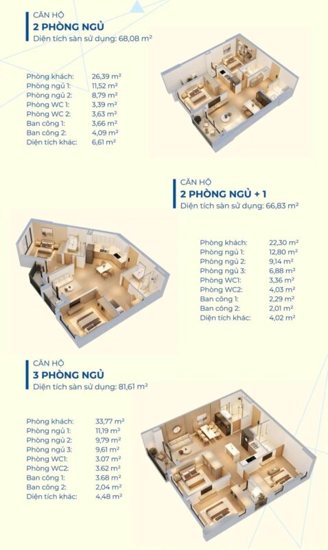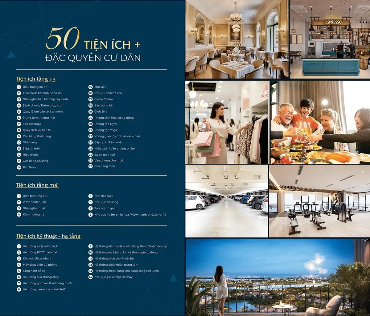 Tiện ích: Bãi đỗ xe, trung tâm thương mại, bể bơi, GYM & SPA, khu vui chơi trẻ em, sân tập yoga, khu ăn uống ngoài trời,….